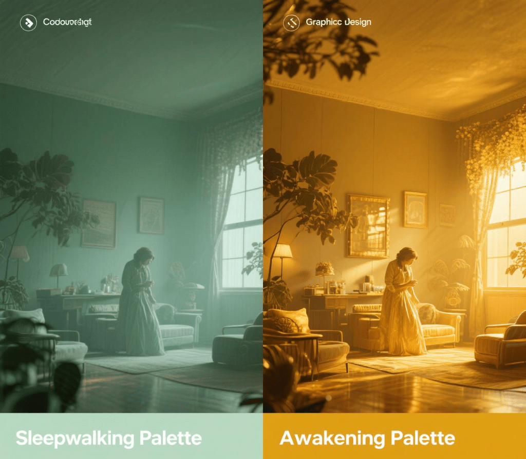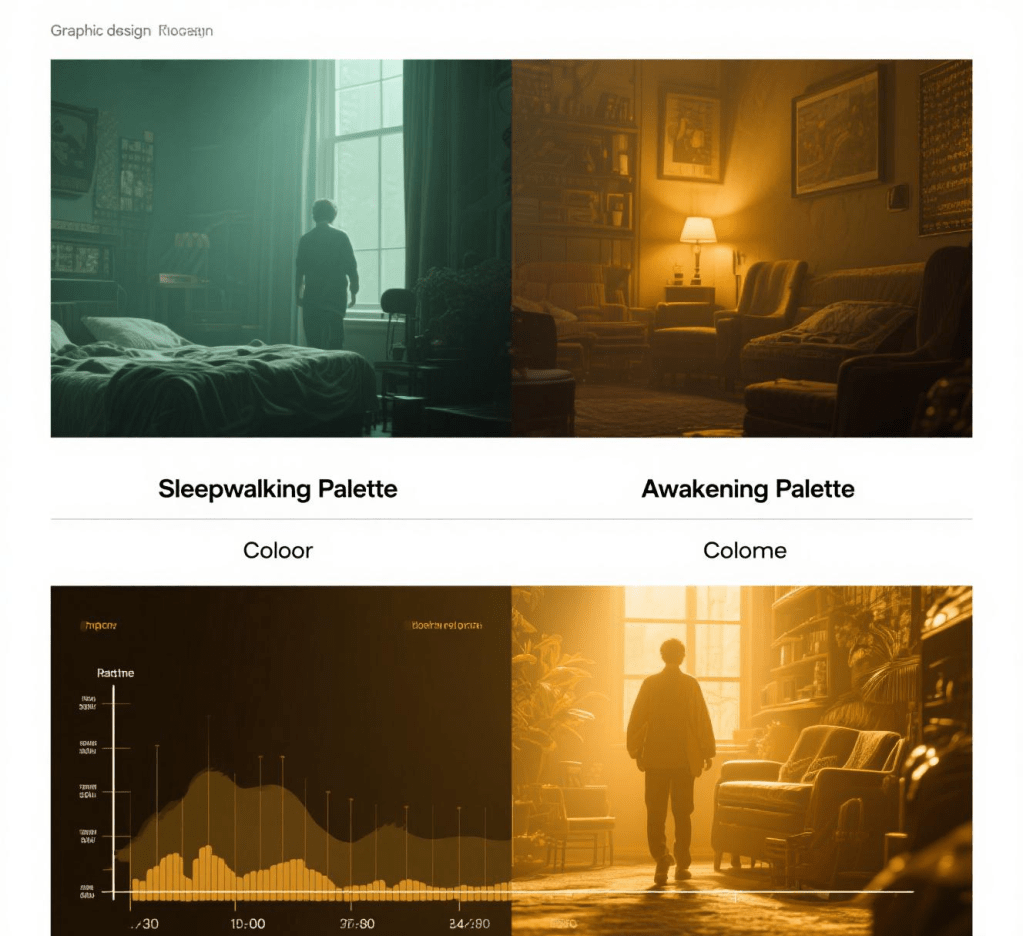 - START (The Sleep): The scene begins in the “Sleepwalking Palette.” The room is lit with a flickering, sickly green fluorescent light. The sound design is harsh, with a low, dissonant hum.