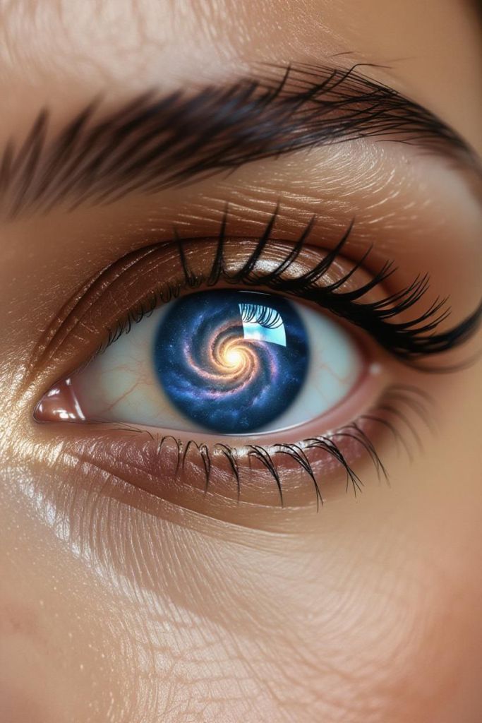 • MOVEMENT: The camera begins on a wide shot, then slowly dollies forward in a gentle Fibonacci spiral path, tightening the focus on their third eye.