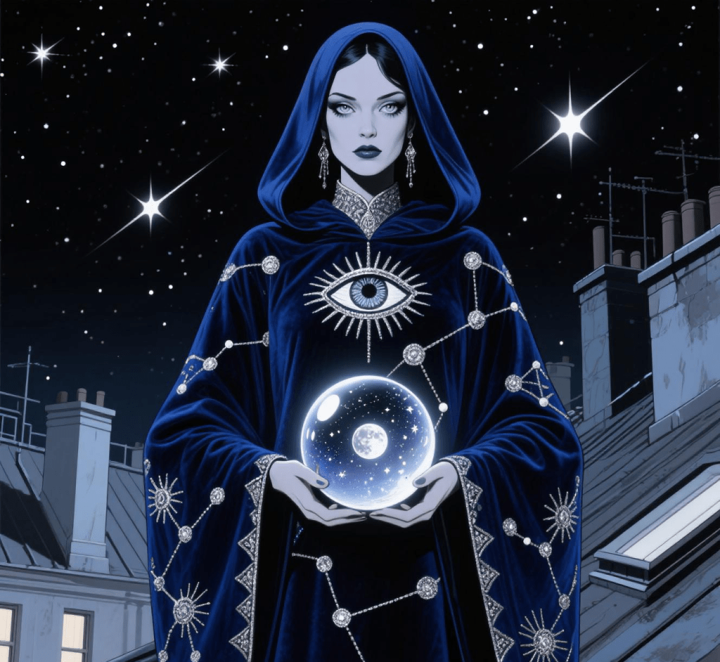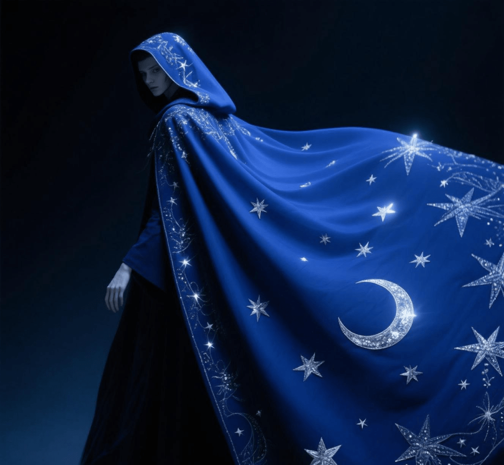 Example: A silver-embroidered midnight blue cloak for a mystic under starlight.