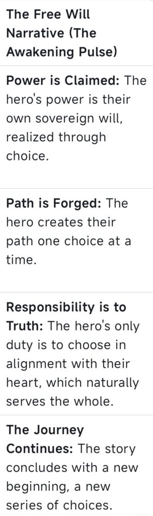 - The Resolution is a Choice. The story does not end with a victory lap. It ends with a Choice of Integration. The character chooses how to embody their new frequency in the “real” world. The final scene is often the first, conscious, sovereign action of their new life.