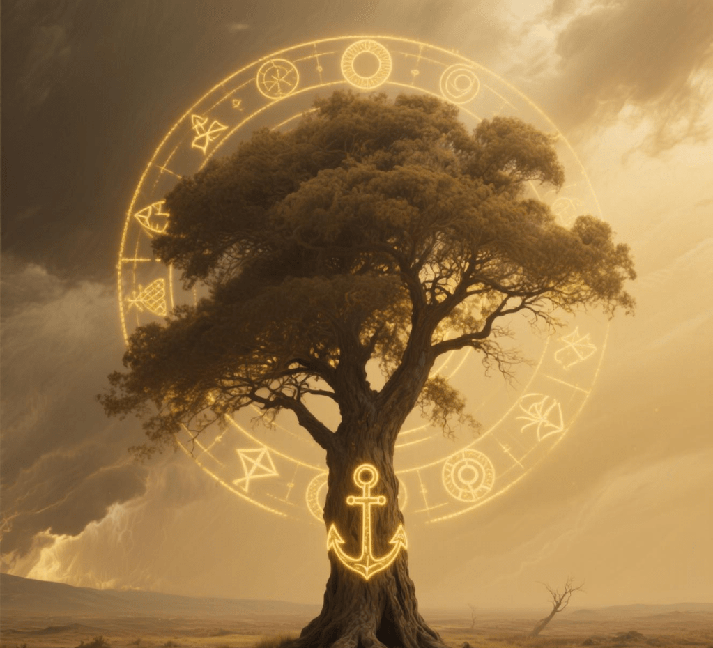 The Final Anchor: The final image. Not a person, but a single, ancient tree in a desolate landscape. The tree is etched with glowing, golden symbols of universal laws. It has weathered all storms not by fighting, but by being true to its nature, an eternal anchor of truth.