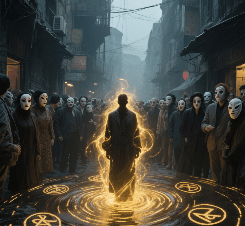 The Ripple of Authenticity: One character makes an authentic, truthful choice. A ripple of coherent, golden energy expands from them, and as it passes through other characters, their own facades and masks briefly flicker and fade.