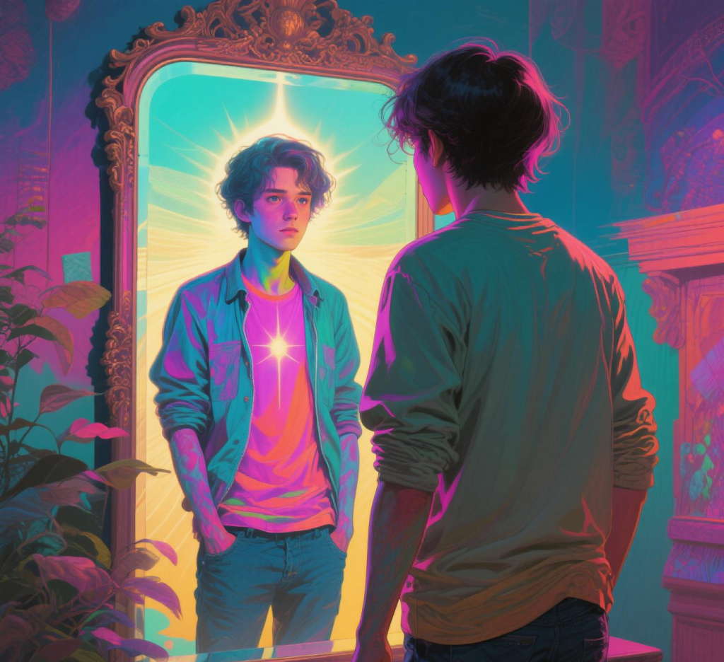 The Mirror of Reality: A character looks into a mirror. Their reflection is not them; it is a hyper-real, vibrant version of their highest self, who simply stares back, waiting for them to recognize the truth.