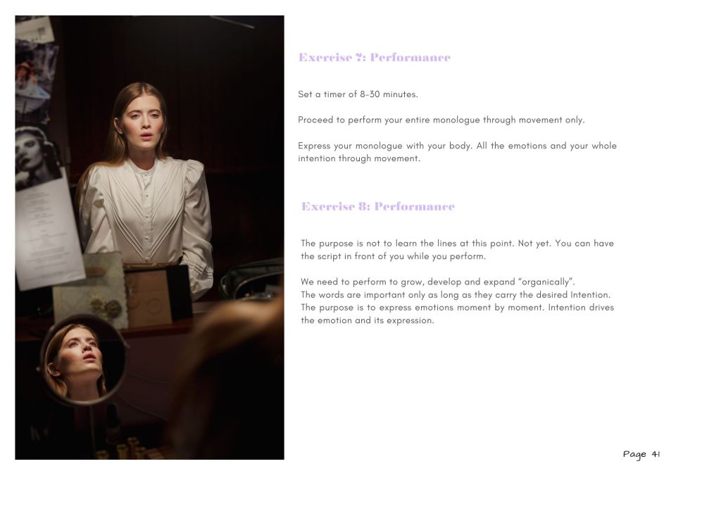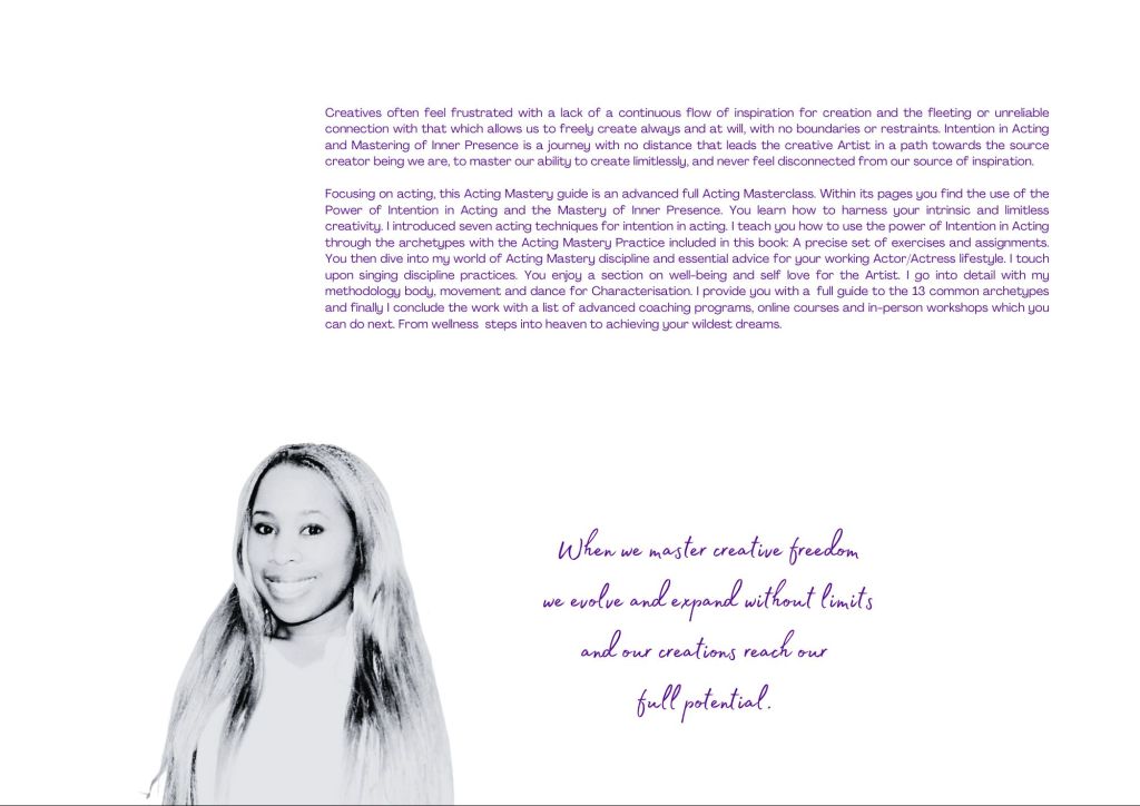 Focusing on acting, this Acting Mastery guide is an advanced full Acting Masterclass. Within its pages you find the use of the Power of Intention in Acting and the Mastery of Inner Presence. You learn how to harness your intrinsic and limitless creativity. I introduced seven acting techniques for intention in acting. I teach you how to use the power of Intention in Acting through the archetypes with the Acting Mastery Practice included in this book: A precise set of exercises and assignments. You then dive into my world of Acting Mastery discipline and essential advice for your working Actor/Actress lifestyle. I touch upon singing discipline practices. You enjoy a section on well-being and self love for the Artist. I go into detail with my methodology body, movement and dance for Characterisation.